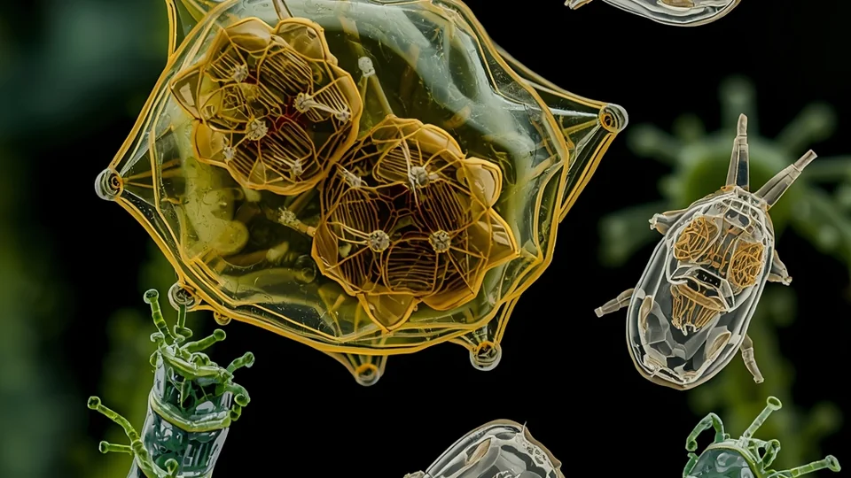 Dijatomeje su posebno fascinantne. Ovi jednoćelijski organizmi grade svoju ćelijsku stijenku od stakla – silicijum-dioksida – u oblicima toliko simetričnih i raznolikih da podsećaju na minijaturnu arhitekturu. Oko 100.000 poznatih vrsta dijatomeja razlikuje se po obliku pancirice, a svaka vrsta je adaptirana na određene uslove temperature, pH i dostupnosti hranjivih materija. Kad dijatomeja ugine, njena staklena pancirica potone na dno i može se sačuvati hiljadama godina – naučnici ih koriste kao indikatore ekoloških promena u prošlosti.